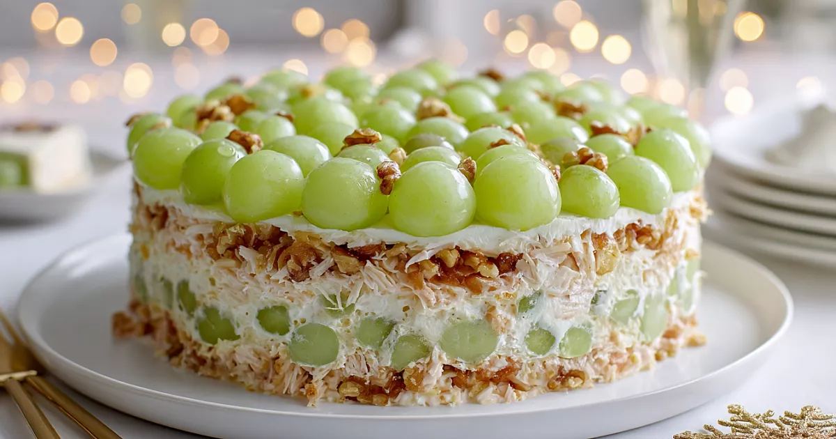 Этот изысканный слоёный салат с курицей, виноградом и орехами в особом сырном соусе получается нежным и гармоничным.