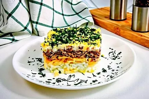 Салат "Австрийский" — это вариация на тему "Мимозы", но с более быстрым приготовлением и уникальным вкусом.