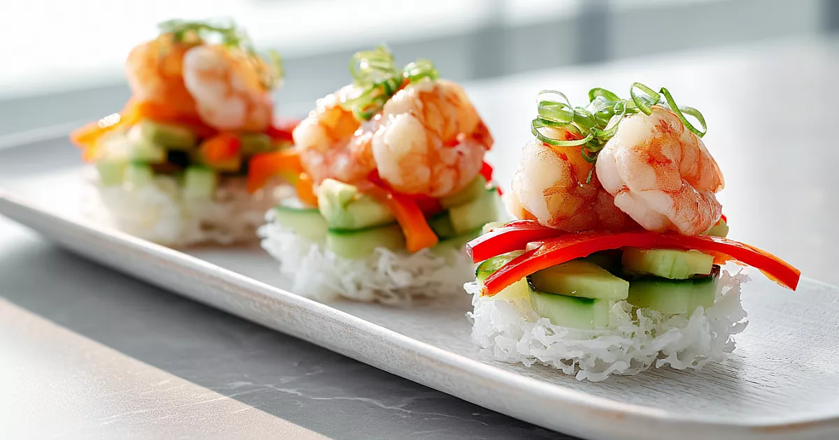 На каждую хрустящую основу кладём полоску огурца, перца, кусочек авокадо и креветку сверху. По желанию посыпаем семенами чиа или кунжута — это добавляет праздничный вид.