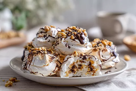 Из белков получается нежное безе с орехами и шоколадом — похоже на Киевский торт, но в виде печенья.