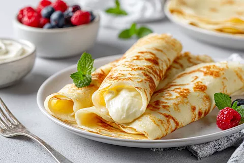 Блинчики тонкие, нежные, не рвутся. Начинка сочная, с ванильным ароматом.