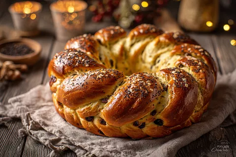 Рождественский калач — красивая и ароматная выпечка к празднику. Тесто опарное, мягкое, с изюмом внутри плетёнки.