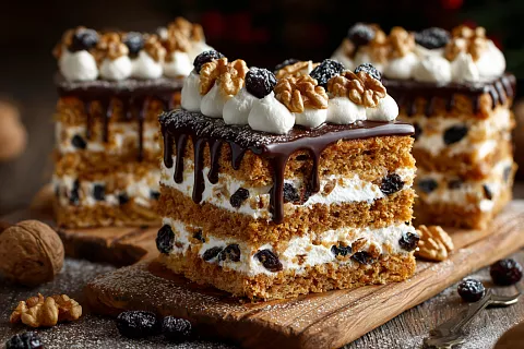 Торт нежный, с медовым ароматом, сочным черносливом и хрустом орехов.