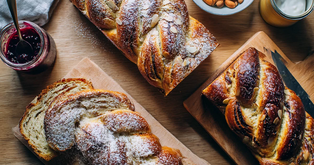 Переворачиваем швом вниз, разрезаем вдоль пополам, не доходя до одного конца. Переплетаем две полоски разрезом вверх, подгибаем концы. Перекладываем на пергамент или в форму 23×11 см. По желанию кладём сверху кусочки сливочного масла для аромата.