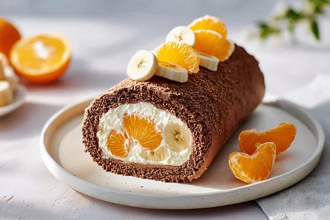 Рулет лёгкий, с бананово-шоколадной основой и сливочным кремом. Мандарины добавляют сочность.