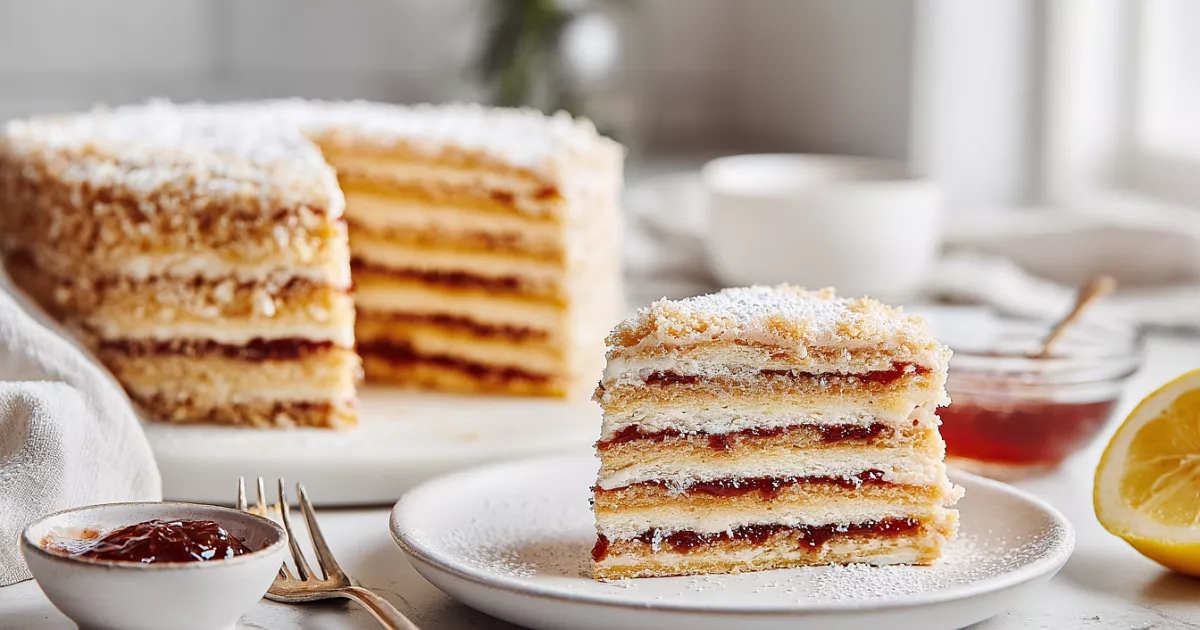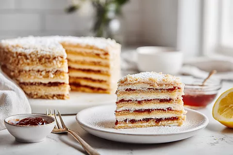 Классический "Бедный студент" — бюджетный слоёный пирог с джемом. Коржи песочные, начинка сочная, готовится просто из доступных продуктов.