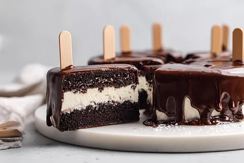 Шоколадный бисквитный торт "Эскимо" — нежный десерт со вкусом мороженого. Коржи пропитанные, крем сливочный, глазурь шоколадная.