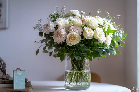 Готовый букет выглядит премиально: зелень даёт текстуру, разные уровни — интерес, единая палитра — гармонию.