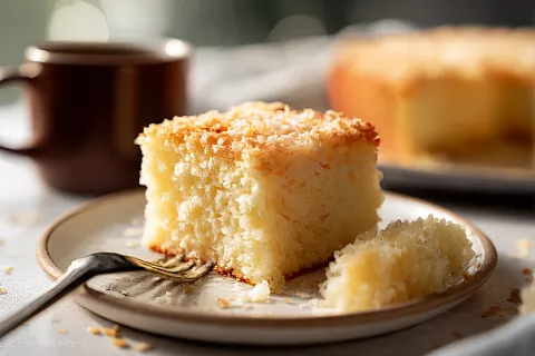 Торт получается влажным внутри, с хрустящей кокосовой корочкой сверху. Очень нежный, с насыщенным вкусом кокоса. Не сухой, не приторный — идеальный баланс сладости.