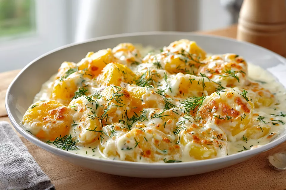 Ароматная картошка в чесночном соусе: добавила тёртый сыр в сметанный соус, и вкус получился сливочным