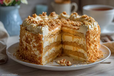 Старинный торт из 80-х — бюджетный, большой и невероятно вкусный. Коржи мягкие, крем сливочный, орехи и сухофрукты добавляют аромат.