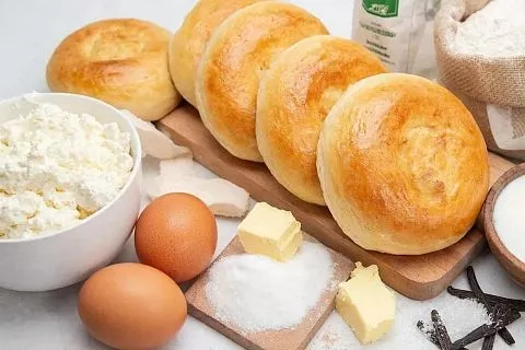 Просто разомните творог вилкой, смешайте с яйцами, сахаром, солью и мягким сливочным маслом, всыпьте муку с разрыхлителем и выпекайте. Для другой быстрой идеи попробуйте пышки на кефире за 20 минут.