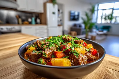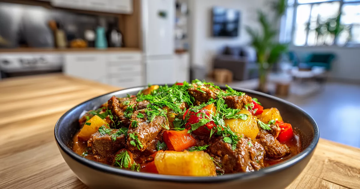 Классическое узбекское жаркое с мясом и картофелем — сытное, ароматное и очень вкусное блюдо.