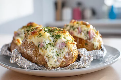 Берём 8 крупных картофелин — каждая больше 400 г. Тщательно моем, чтобы кожица была чистой. Каждую заворачиваем в фольгу герметично, чтобы не высохла. Выкладываем на противень и ставим в разогретую до 180–200 °C духовку на 1 час – 1 час 10 минут. Картошка должна стать мягкой внутри — проверяем зубочисткой или ножом. Если плотно — допекаем ещё 10–15 минут. Не нужно смазывать маслом — и так получится нежно и кремово.