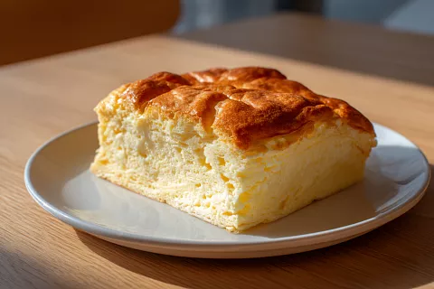 Омлет немного осядет — это нормально. Нарезаем и подаём на подогретые тарелки — так он не осядет сильно и останется тёплым. Получается нежный, дрожащий, с невероятным сливочным вкусом — как в детстве.