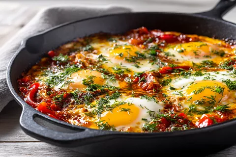 Шакшука по-домашнему: яйца в томатном соусе с перцем и специями — как в кафе