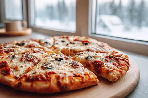 Готовую пиццу разрезаем и подаём горячей — получается тонкая, хрустящая и очень сочная. Идеально к чаю или как быстрый ужин.