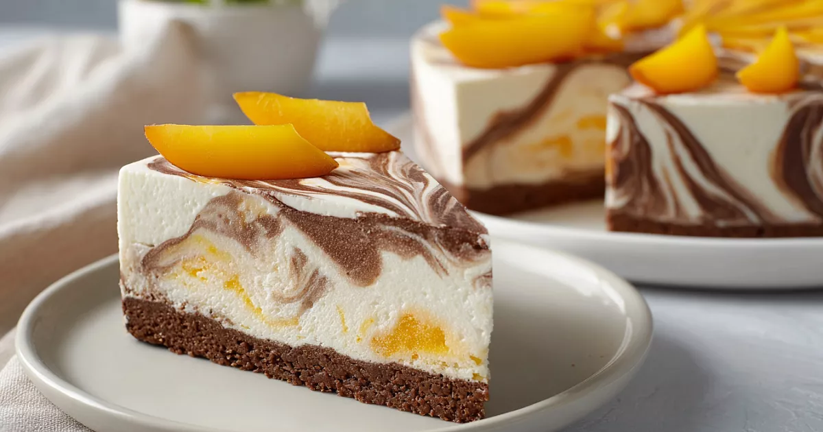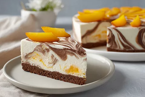 Воздушный йогуртовый торт с шоколадным бисквитом, кремовым муссом и персиками получается лёгким, освежающим и очень красивым в разрезе.