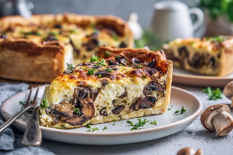Насыщенный грибной пирог с нежной сметанной заливкой и сырной корочкой получается сочным внутри и с хрустящей основой — гости всегда просят добавки.