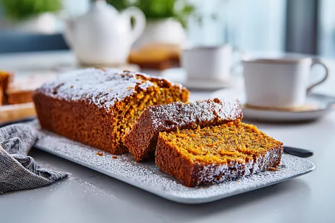Полностью остывший пирог нарезаем порционно и посыпаем сахарной пудрой. Он получается очень сочным, пористым и ароматным — с ярким вкусом моркови, апельсина и пряностей. Пробуйте — на следующий день он ещё вкуснее.