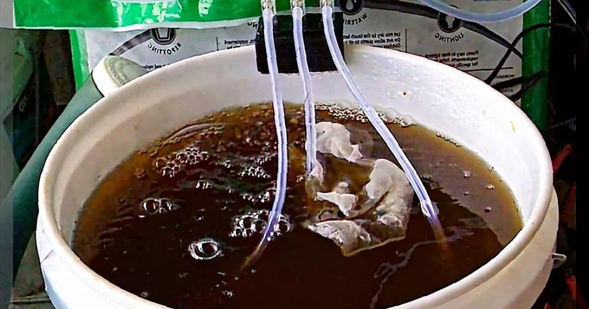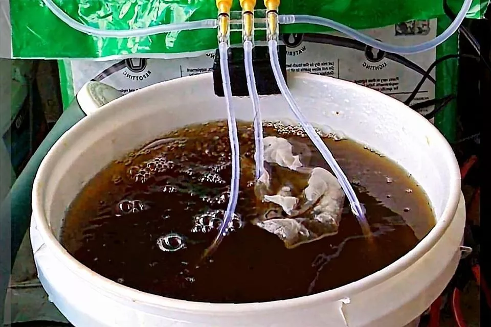 Способ №3: Этот метод аналогичен предыдущим, но с добавлением аэрации. Во время настаивания используйте компрессор и аэраторный камень (можно приобрести в зоомагазине). Аэрация важна для улучшения качества компостного «чая». Без постоянного притока кислорода аэробные бактерии погибают, а их место занимают анаэробные микроорганизмы, вызывающие неприятный запах. Как река насыщается кислородом и не дает размножаться вредным микробам, так и аэрированный компостный «чай» становится более полезным.