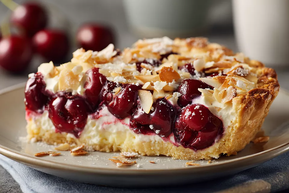 Этот пирог получается очень вкусным, мягким и ароматным. Вишня даёт приятную кислинку, сметанный крем — нежность, а миндальные лепестки — красивую корочку.