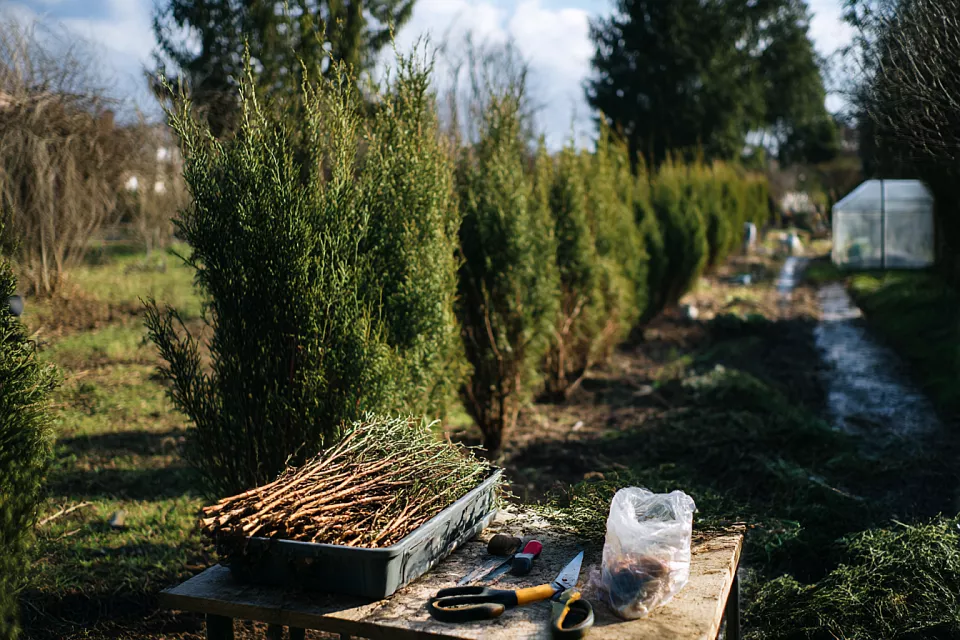 Черенкование проводят ранней весной, сразу после схода снега и до начала сокодвижения. В это время растение ещё спит, стрижка проходит безболезненно, а черенки лучше укореняются. После стрижки туи остаётся много веточек — из них и берут материал.