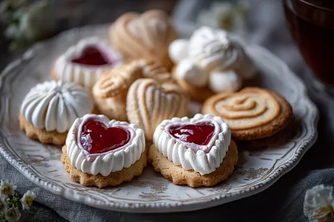 Печенье получается очень красивое, хрупкое и нежное. Песочное основание рассыпается во рту, меренга лёгкая и сладкая, а джем добавляет приятную кислинку. Обязательно попробуйте — это настоящая австрийская классика!