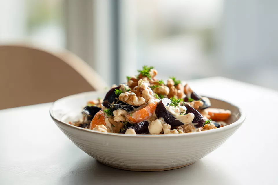 Салат с грибами, черносливом и орехами — сочный, сытный и без мяса