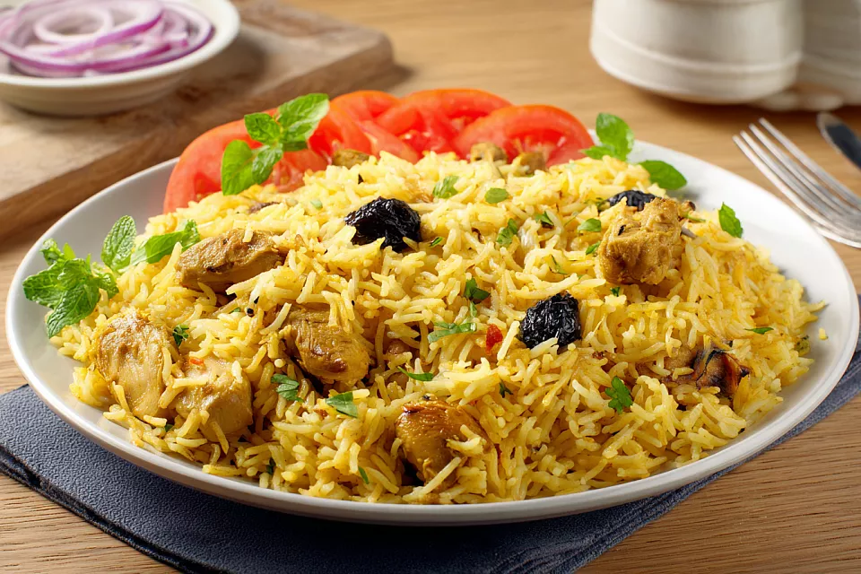Ароматный, рассыпчатый плов с курицей и овощами всего за 15 минут — без долгого томления и казана. Специи и изюм дают настоящий вкус плова. К нему — свежий салат «Ачучук» из помидоров, лука и базилика.