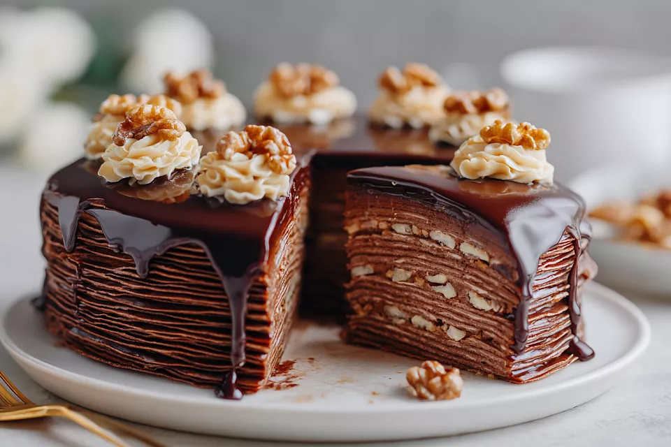 Получается потрясающий, яркий и ароматный торт: тонкие шоколадные блинчики, нежный крем со сгущёнкой, орехами и черносливом, всё в шоколадной глазури. Готовится без хлопот, выглядит как из кондитерской!