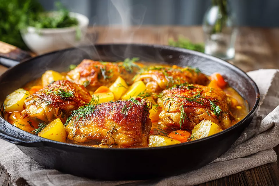 1 кг картофеля нарежьте крупными кусочками, добавьте к мясу и овощам. Перемешайте, добавьте 1 лавровый лист и залейте кипятком так, чтобы чуть покрыло. Тушите под крышкой на маленьком огне 20–25 минут до готовности картофеля. В конце щедро посыпьте рубленым укропом, дайте потомиться 3 минуты под крышкой — аромат разнесётся по всему дому!