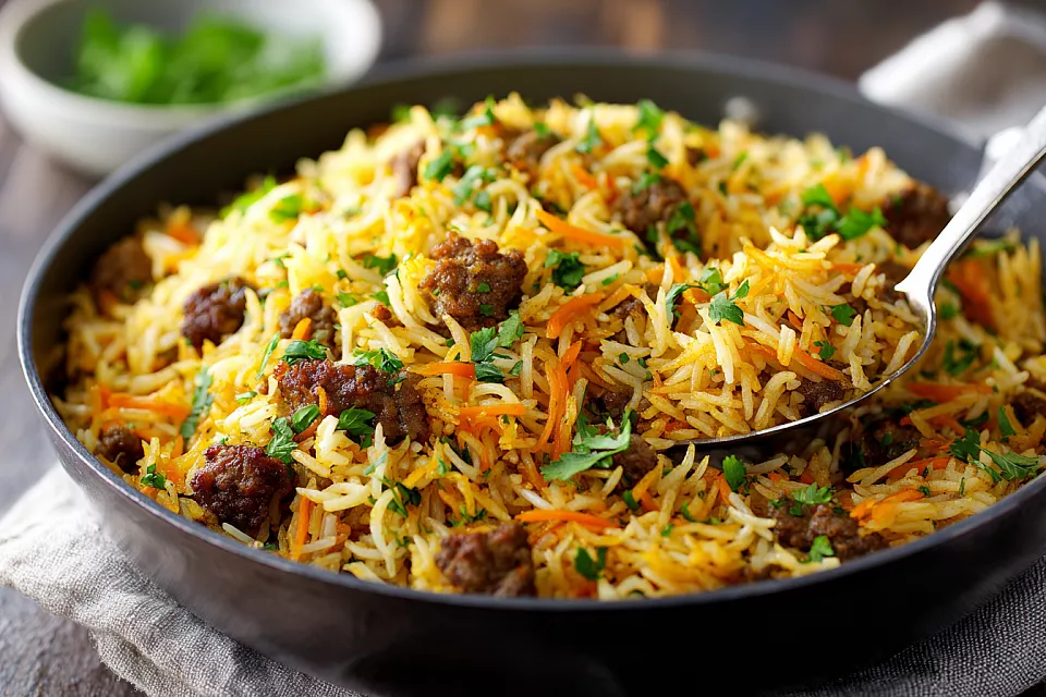 Получается невероятно ароматный, рассыпчатый и сочный рис с мясом — блюдо, которое выручает, когда нет времени, но хочется накормить семью по-царски! Всё в одной сковороде за 30 минут, минимум возни, максимум вкуса.