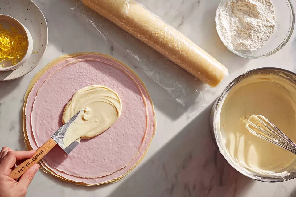 Получается настоящий шедевр без духовки: тонкие ароматные блинчики, пропитанные нежнейшим заварным кремом с лимонной цедрой и ванилью, закрученные в роскошный розовый цветок!