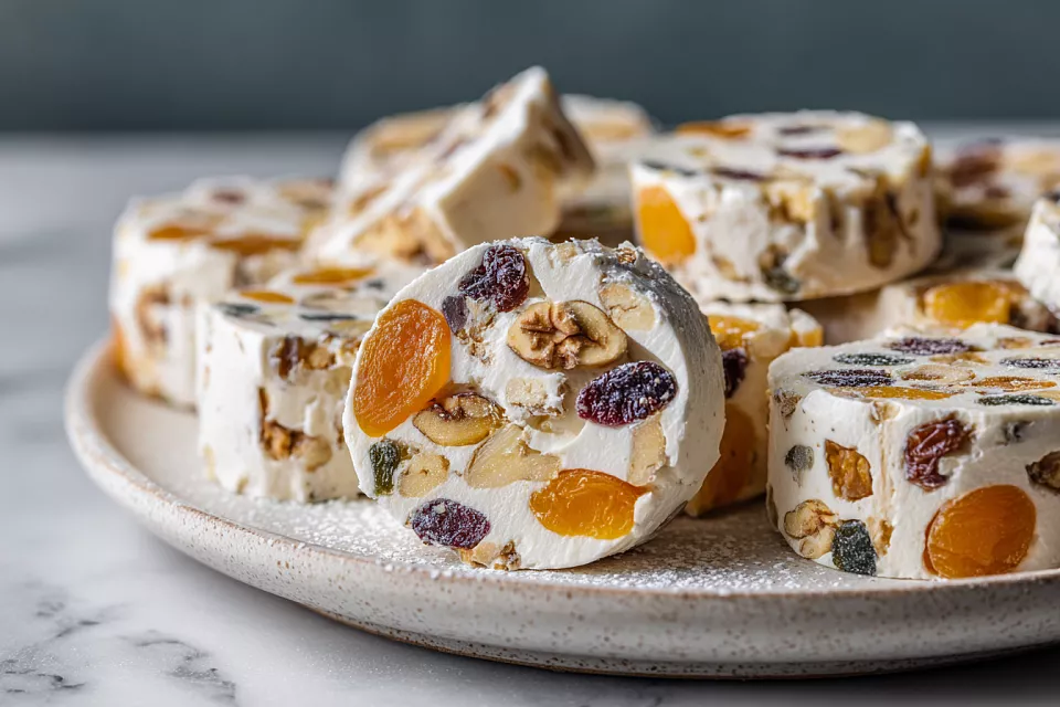В растопленную массу добавляем нарезанные сухофрукты, орехи и обе части печенья — крошку и крупные кусочки. Всё тщательно перемешиваем. Массу выкладываем на пергамент или пищевую плёнку, формируем плотный рулет весом около 490 г. Заворачиваем плотно и убираем в холодильник на 3–4 часа до полного застывания. Готовый десерт нарезаем ломтиками — держит форму идеально. Посыпаем сахарной пудрой 20–30 г.