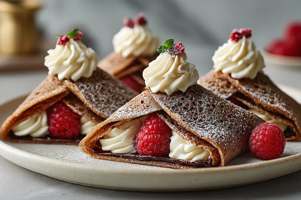 250 г холодного маскарпоне взбиваем с 250 мл жирных холодных сливок 38 % и 2 ст. л. сахарной пудры с горкой до пышной устойчивой массы. Перекладываем крем в кондитерский мешок с насадкой. Остывшие блинчики собираем: кладём немного крема в центр, защипываем края в треугольник — необжаренная сторона легко лепится. Сверху украшаем розеткой крема и кусочками сублимированной малины или свежими ягодами. Получаются аккуратные, нежные и очень вкусные треугольные пирожные.
