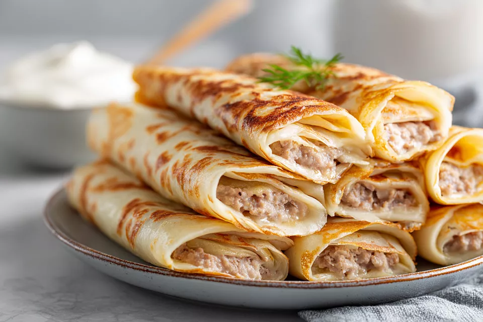 Эта заготовка — настоящая находка для занятых хозяек. Готовим фарш и тесто впрок, замораживаем порционно — и в любой момент можно быстро пожарить нежные блинчики с сочной начинкой.