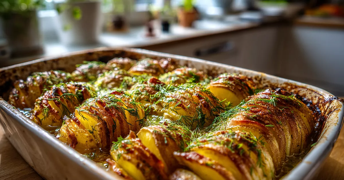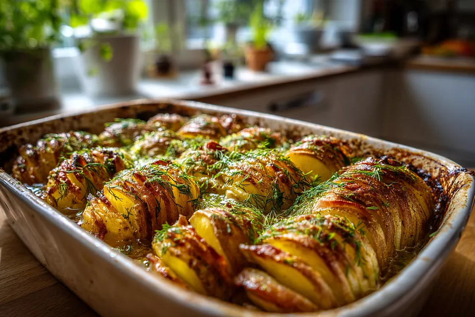 Проверяем готовность зубочисткой — картошка должна быть мягкой. Пока блюдо в духовке, готовим чесночную намазку: растапливаем 50 г сливочного масла, добавляем 3 измельчённых зубчика чеснока и мелко нарезанный укроп. Горячее блюдо сразу щедро смазываем этой ароматной смесью, даём постоять 10 минут — аромат просто сводит с ума.