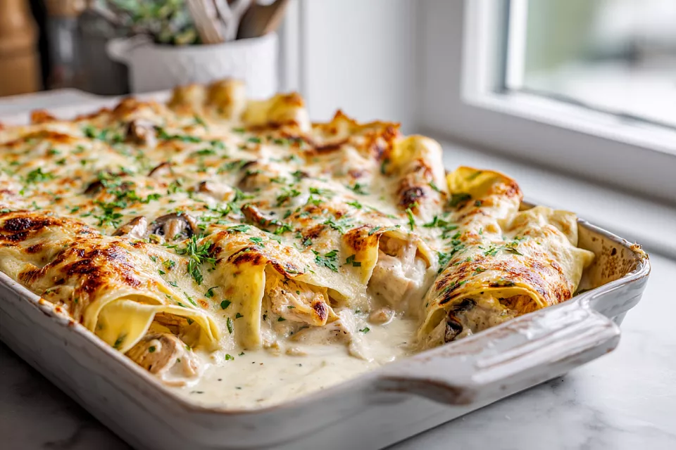 Нежные блинчики с сочной начинкой из курицы и грибов запечённые под сливочно-сырным соусом — уютное и очень вкусное блюдо для всей семьи.