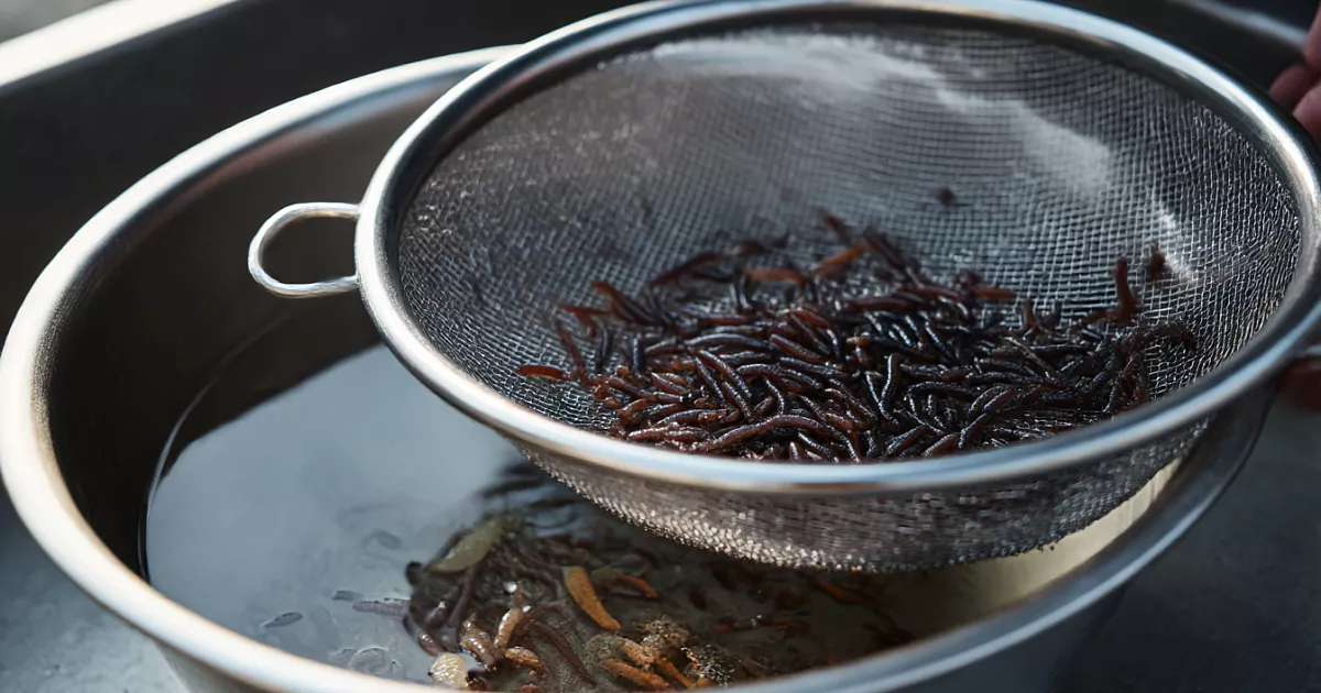Берём баночку с мотылем, наливаем чистую холодную воду — столько, чтобы мотыль свободно плавал. Оставляем на 15–30 минут. За это время он напьётся, станет тёмным, упругим и подвижным. Вялые и бледные экземпляры сразу отбираем — они не нужны.