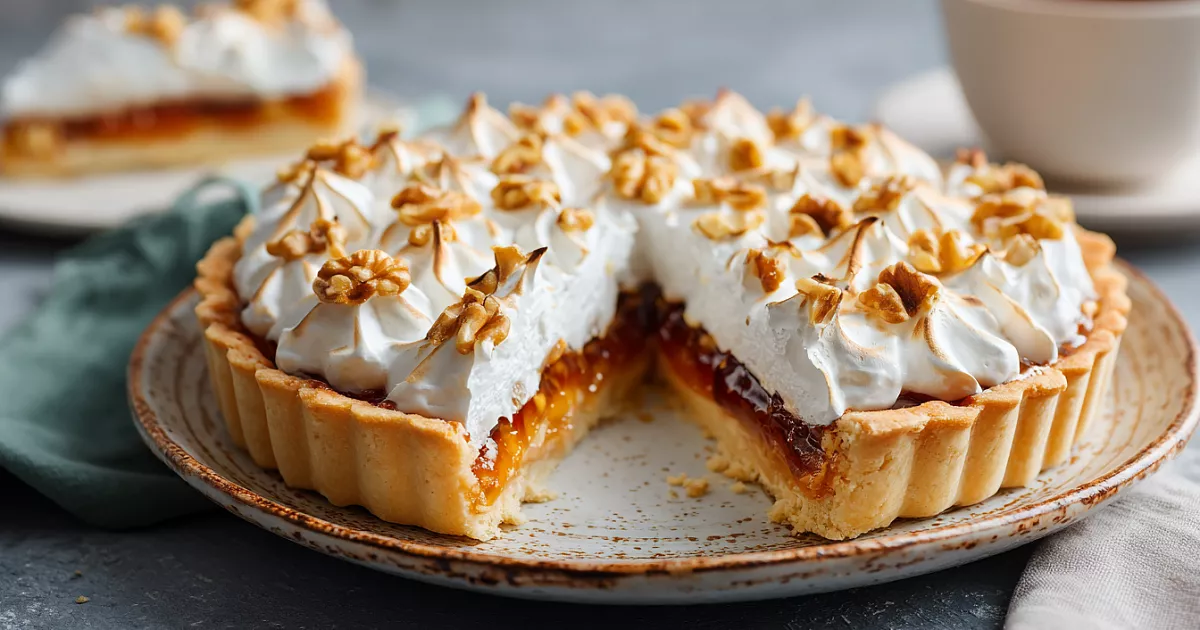 Этот пирог — настоящее наслаждение: хрустящая песочная основа, нежная меренга и кисло-сладкое варенье с орешками. Готовится просто, выглядит красиво и невероятно вкусно — идеально к чаю или празднику.