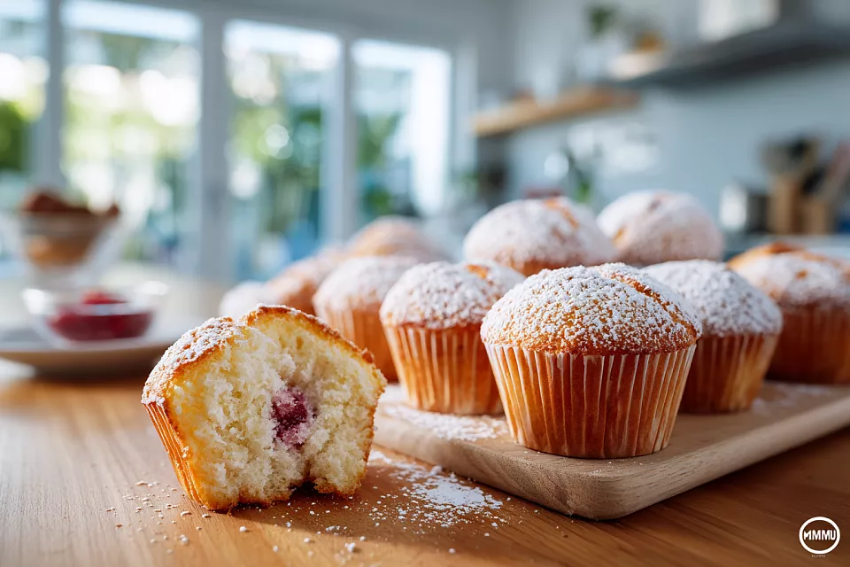 Формочки для маффинов смазываем маслом, посыпаем мукой, выкладываем тесто. Сверху кладём немного варенья или свежие ягоды. Запекаем в разогретой до 180 °C духовке 20–25 минут. Проверяем зубочисткой — сухая значит готовы. Посыпаем сахарной пудрой. Маффины получаются мягкие, нежные и невероятно вкусные.