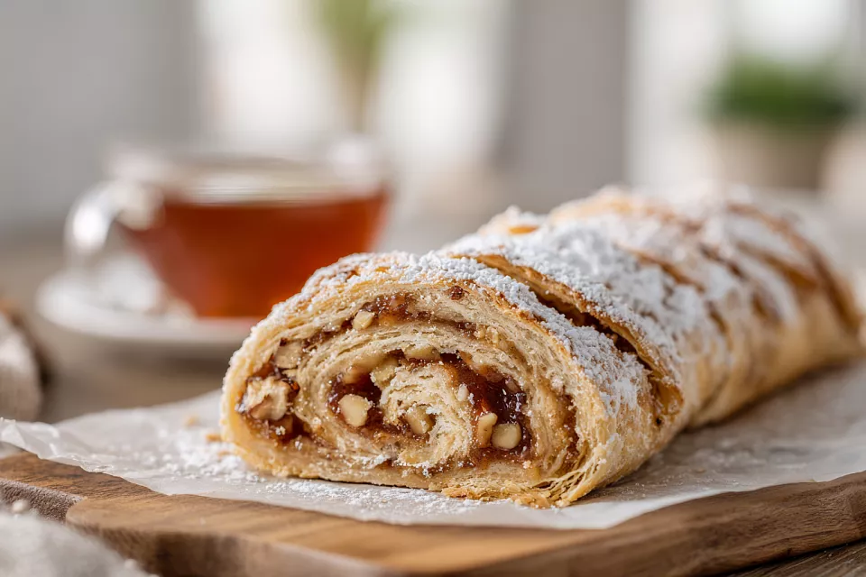 Раскатываем тесто на пергаменте в прямоугольник 25×30 см. Смешиваем 120 г варенья с кислинкой (лучше сливовое) и 30 г порубленных орехов. Равномерно распределяем по тесту, оставляя края. Лайфхак: варенье с кислинкой балансирует сладость и не даёт рулету быть приторным. Подгибаем края, заворачиваем рулет с помощью бумаги, защипываем шов, кладём швом вниз. По желанию смазываем молоком, посыпаем сахаром. Запекаем при 180 °C 25–30 минут.