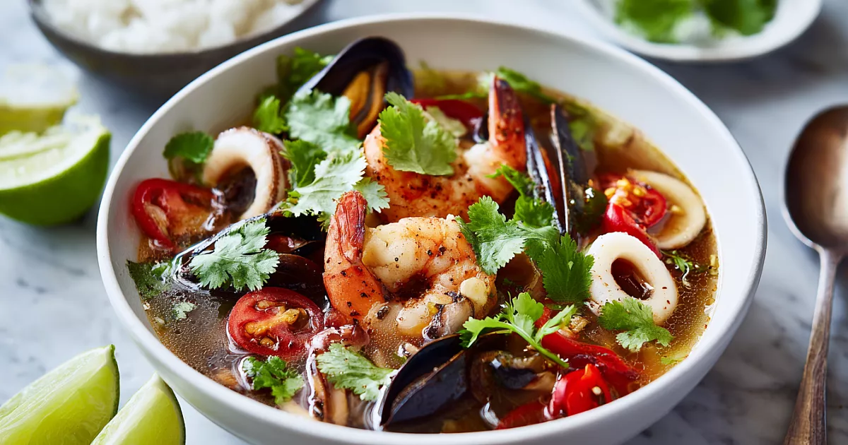 Настоящий том ям без лишних сложностей: сочные морепродукты, яркий вкус, кислинка лайма и кокосовое молоко. Готовится за 20–25 минут — целая кастрюля супа, который возвращает к жизни после праздников!