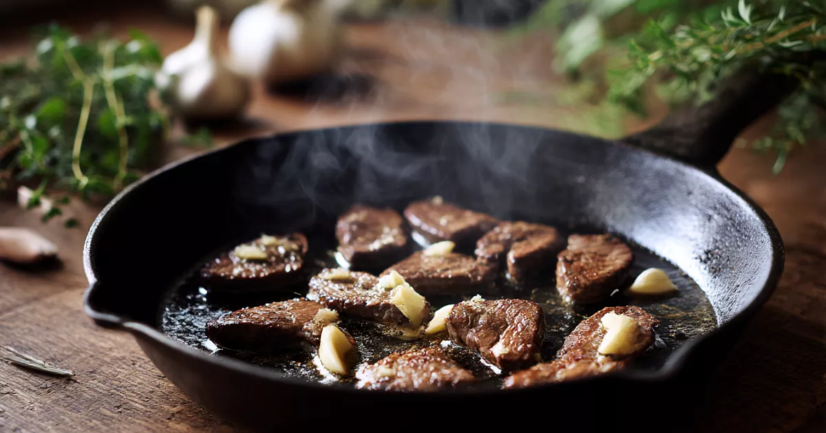 Перед жаркой слегка обсушите кусочки чтобы не было лишней влаги — иначе корочки не будет. Жарьте на сильном огне в раскалённом масле или сливочном по 1–2 минуты с каждой стороны. Внутри должна остаться лёгкая розовинка — пережаренная печёнка становится резиновой. В конце можно добавить кусочек сливочного масла и раздавленный зубчик чеснока — аромат будет потрясающий.