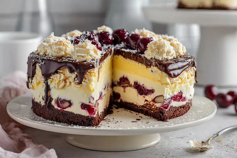 Торт получается невероятно красивым в разрезе: слои чёткие, крем воздушный, вишня сочная. Идеально к празднику или просто к чаю. Попробуйте — он покорит всех.