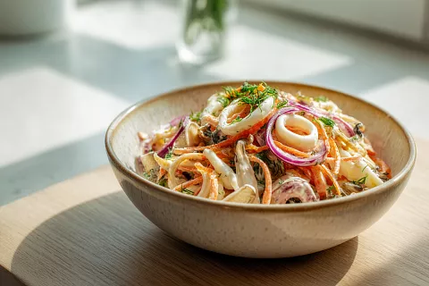 Салат с курицей, кальмарами и корейской морковкой — необычно и очень вкусно