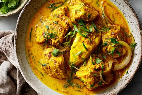 Выкладываем обжаренную рыбу в соус. Накрываем крышкой и тушим на маленьком огне 15–20 минут. В конце посыпаем свежей зеленью (зелёный лук и кинза).