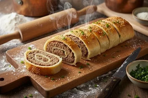 Фарш готовим как обычно: 500 г смешанного мяса, 1 луковица, соль, перец по вкусу. Секрет метода — в технике формирования. Раскатываем тесто в тонкий прямоугольник, равномерно распределяем фарш, оставляя края свободными. Затем аккуратно сворачиваем в плотный рулет.