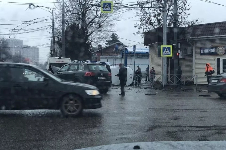В Краснодаре во время ДТП перевернулся автомобиль «скорой помощи» (видео)